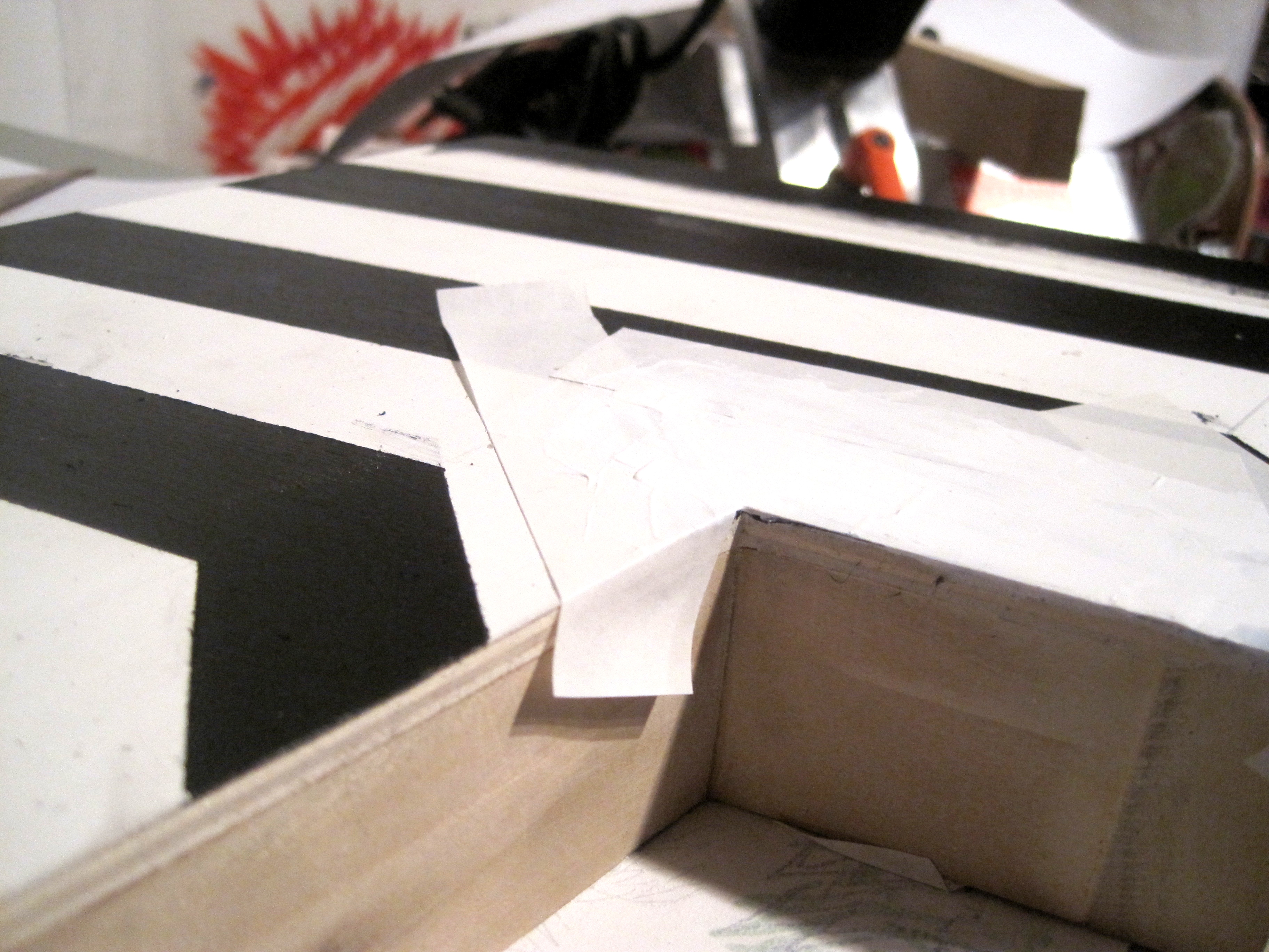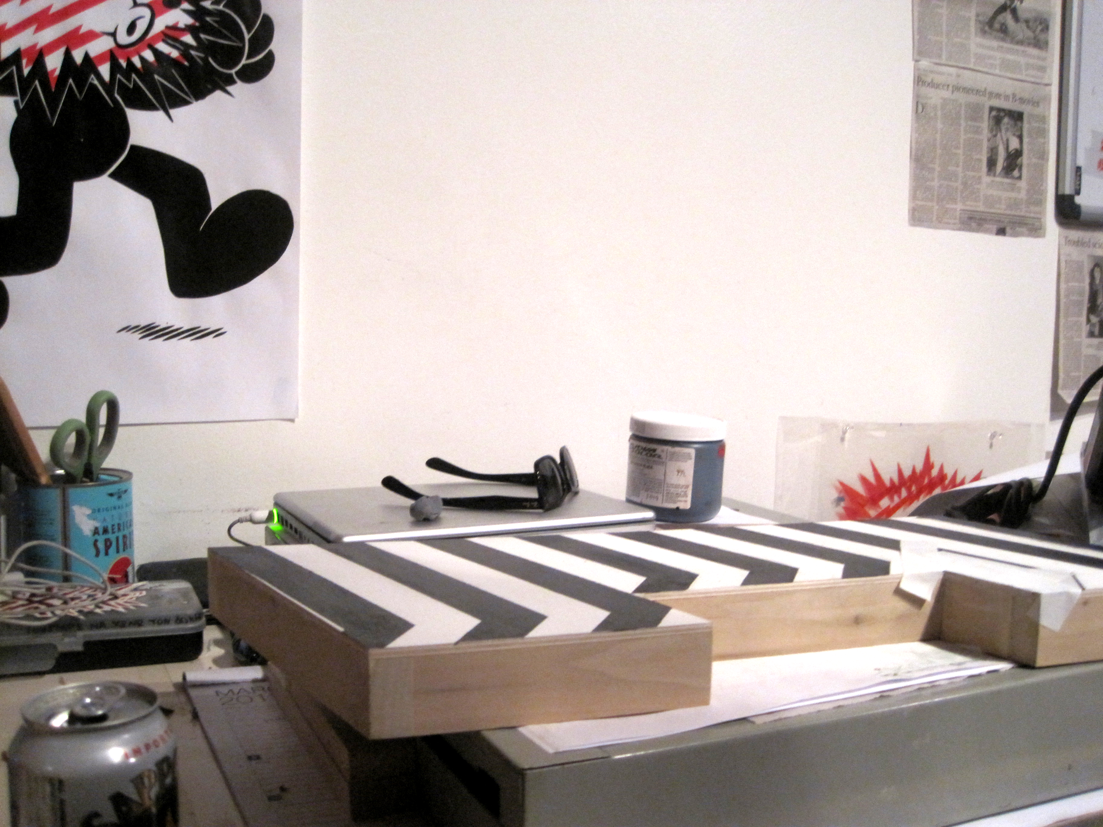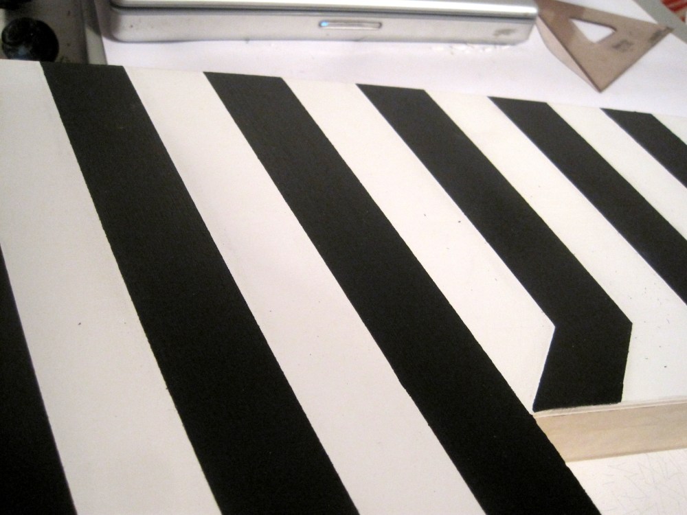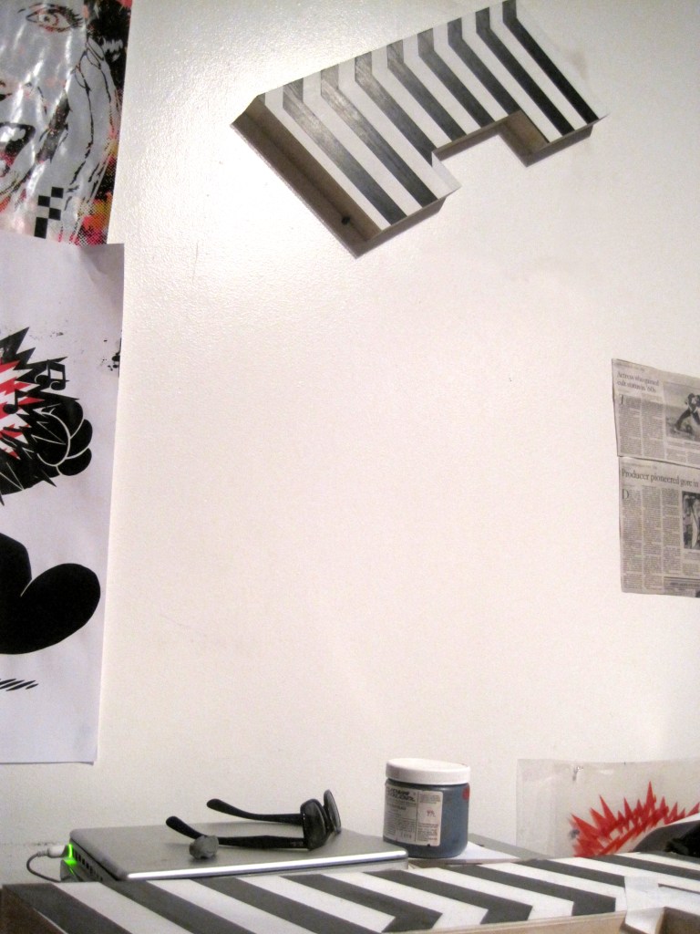 Rubylith & Stella Sometimes I get in such a zone when I’m making stuff here at the shop – for example, I’ve been obsessed with my Frank Stella-like piece I had drawn in the margin of a newspaper while working on the crossword puzzle (I tend to do this a lot when the puzzle is kicking my ass) It’s part op art, stripe painting, and reminiscent of Stella’s “Portrait of Carl Andre”.